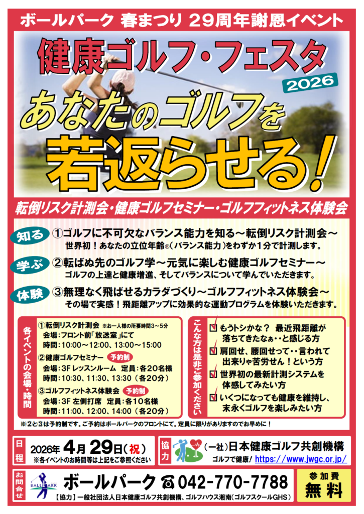 相模原にあるゴルフ練習場、ボールパークの「春まつり29周年謝恩イベント」です。ゴルフに不可欠なバランス能力を知る「転倒リスク計測会」と、ゴルフの上達と健康増進について学ぶ「健康ゴルフセミナー」、そして飛距離アップに効果的な運動プログラム「ゴルフフィットネス体験会」の3部構成です。