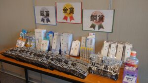 (左写真)賞品は口腔ケアグッズと協賛いただいた高タンパクのレトルト食品です